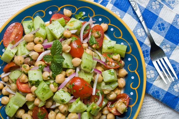 Take a bowl and add 1 tbsp of olive oil and lemon juice and whisk. Add some crushed red pepper, a little chopped garlic and some oregano. Boil the chickpeas and then transfer them into this bowl. Chop some fresh cucumbers and add them too. You can also add chopped tomatoes if you like. Keep the bowl in your fridge for 30 minutes and the salad will be ready.