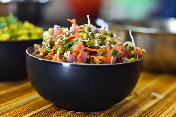 Mix your favourite sprouts, boil the potatoes and chop them into small pieces and add them to the sprouts and transfer the contents in a bowl. Add sliced carrot, onion, and green chilli to it. For taste add yoghurt, and roasted cumin powder. Place on a bed of lettuce. Chill and have this tasty salad while you work.