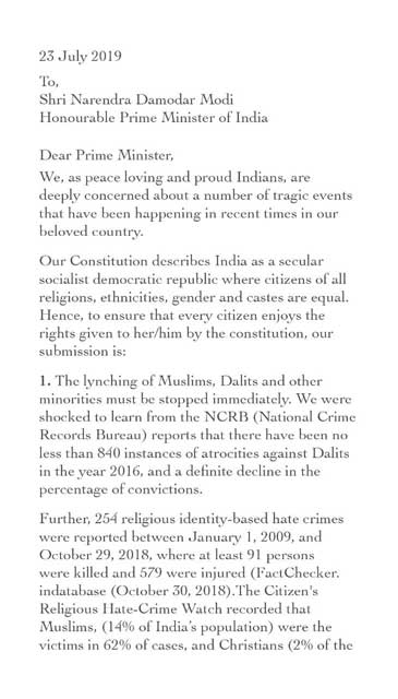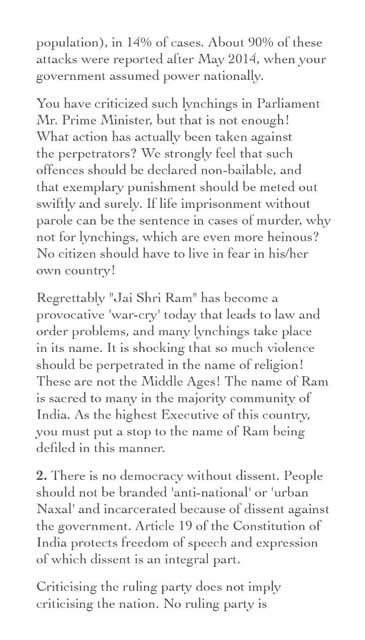 "Regrettably 'Jai Shree Ram' has become a provocative war-cry today", "The name of Ram is sacred to many in the majority community of India... put a stop to the name of Ram being defiled", "Over 254 religious identity-based hate crimes were reported between January 1, 2009, and October 29, 2018", "840 instances of atrocities against Dalits in the year 2016", "Dear Prime Minister, what action has been taken against the perpetrators?"