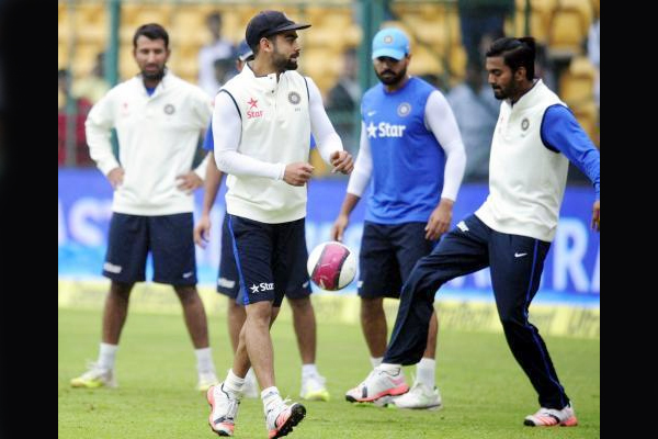 When rain delayed the start of the fourth day of the second test match at M Chinnaswamy Stadium in Bengaluru, between Indian and South Africa, on 17 November 2015, India cricketers like Virat Kohli, Murali Vijay and Cheteswara Pujara, R Ashwin, Ishant Sharma had a warm up on the ground. Most Cricketers played with Soccer ball as they waited for the resumption of the play.